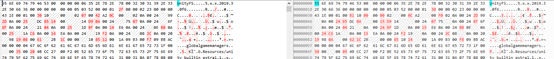 16進エディタでハードニング前後のリソースファイルを比較します。
