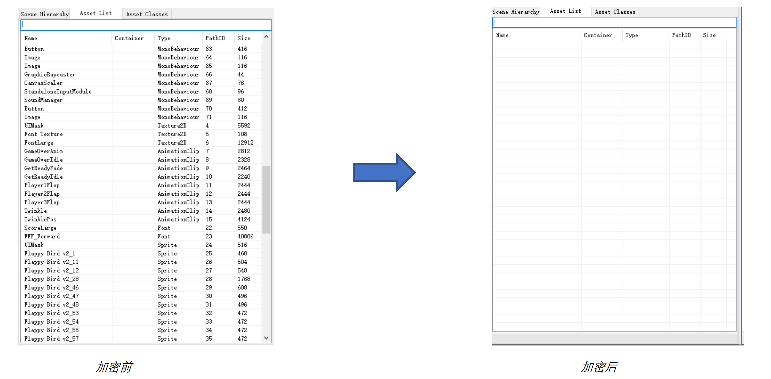 アンパッキングツールで暗号化前後のファイルを展開します。暗号化前は正常に解析できますが、暗号化後は正常に解析できなくなります。
